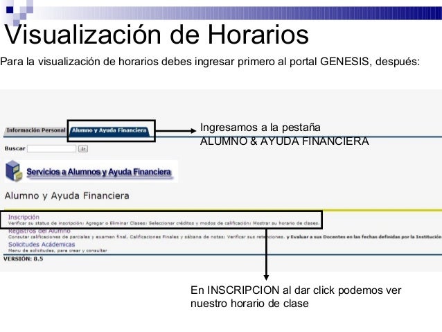 10. Visualización de HorariosPara la visualización de horarios debes ingresar primero al portal GENESIS, después: Ingresamos a la pestaña ALUMNO & AYUDA FINANCIERA En INSCRIPCION al dar click podemos ver nuestro horario de clase