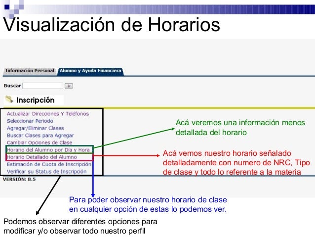 11. Visualización de Horarios Acá veremos una información menos detallada del horario Acá vemos nuestro horario señalado detalladamente con numero de NRC, Tipo de clase y todo lo referente a la materia Para poder observar nuestro horario de clase en cualquier opción de estas lo podemos ver.Podemos observar diferentes opciones paramodificar y/o observar todo nuestro perfil