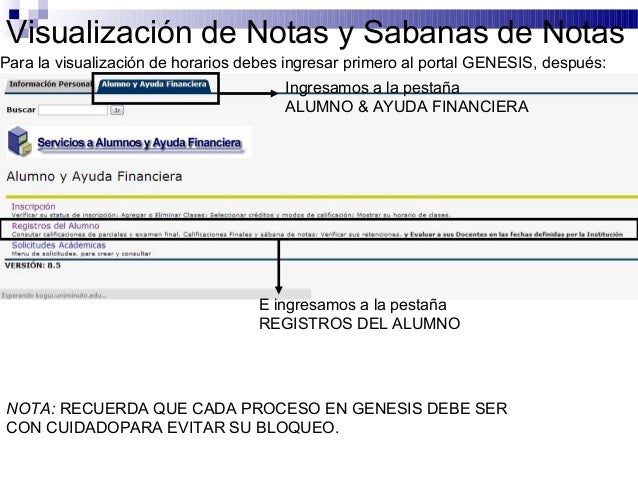 12. Visualización de Notas y Sabanas de NotasPara la visualización de horarios debes ingresar primero al portal GENESIS, después: Ingresamos a la pestaña ALUMNO & AYUDA FINANCIERA E ingresamos a la pestaña REGISTROS DEL ALUMNONOTA: RECUERDA QUE CADA PROCESO EN GENESIS DEBE SERCON CUIDADOPARA EVITAR SU BLOQUEO.