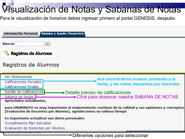 13. Visualización de Notas y Sabanas de NotasPara la visualización de horarios debes ingresar primero al portal GENESIS, después: Acá encontramos nuestro promedio a la fecha, y las notas impuestas por docentes Detalle preciso de calificaciones Click para observar nuestra SABANA DE NOTAS Diferentes opciones para seleccionar