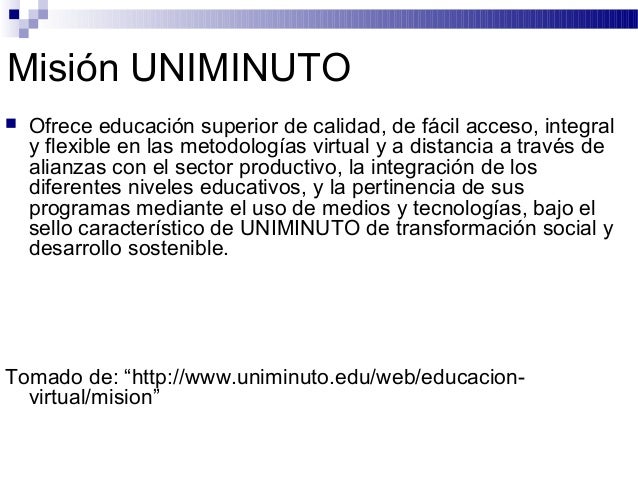 2. Misión UNIMINUTO Ofrece educación superior de calidad, de fácil acceso, integral y flexible en las metodologías virtual y a distancia a través de alianzas con el sector productivo, la integración de los diferentes niveles educativos, y la pertinencia de sus programas mediante el uso de medios y tecnologías, bajo el sello característico de UNIMINUTO de transformación social y desarrollo sostenible.Tomado de: “http://www.uniminuto.edu/web/educacion- virtual/mision”