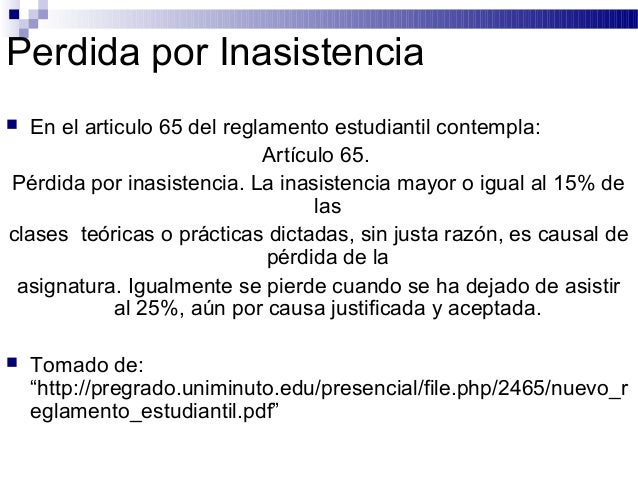 5. Perdida por Inasistencia En el articulo 65 del reglamento estudiantil contempla: Artículo 65.Pérdida por inasistencia. La inasistencia mayor o igual al 15% de lasclases teóricas o prácticas dictadas, sin justa razón, es causal de pérdida de la asignatura. Igualmente se pierde cuando se ha dejado de asistir al 25%, aún por causa justificada y aceptada. Tomado de: “http://pregrado.uniminuto.edu/presencial/file.php/2465/nuevo_r eglamento_estudiantil.pdf”