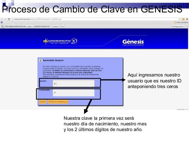 7. Proceso de Cambio de Clave en GENESIS Aquí ingresamos nuestro usuario que es nuestro ID anteponiendo tres ceros Nuestra clave la primera vez será nuestro día de nacimiento, nuestro mes y los 2 últimos dígitos de nuestro año.