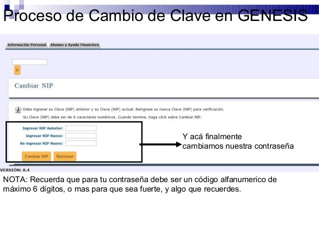 9. Proceso de Cambio de Clave en GENESIS Y acá finalmente cambiamos nuestra contraseñaNOTA: Recuerda que para tu contraseña debe ser un código alfanumerico demáximo 6 dígitos, o mas para que sea fuerte, y algo que recuerdes.